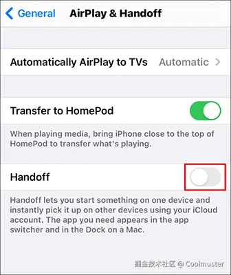 步骤1.在两台iPhone上,前往“设置”>“常规”>“AirPlay和Handoff”,并确保“Handoff”功能已启用。
