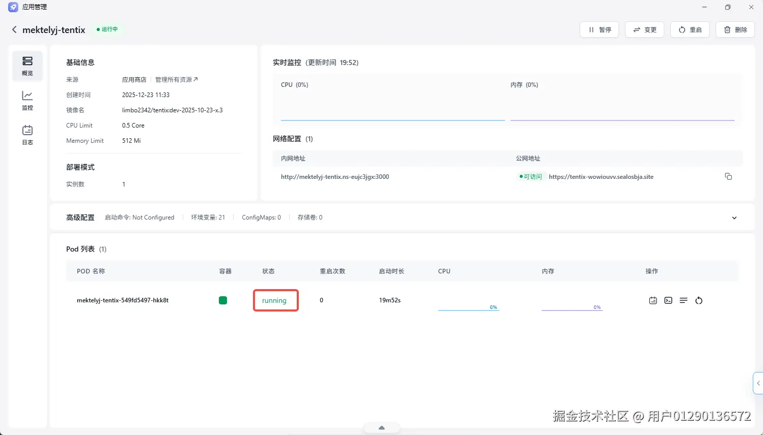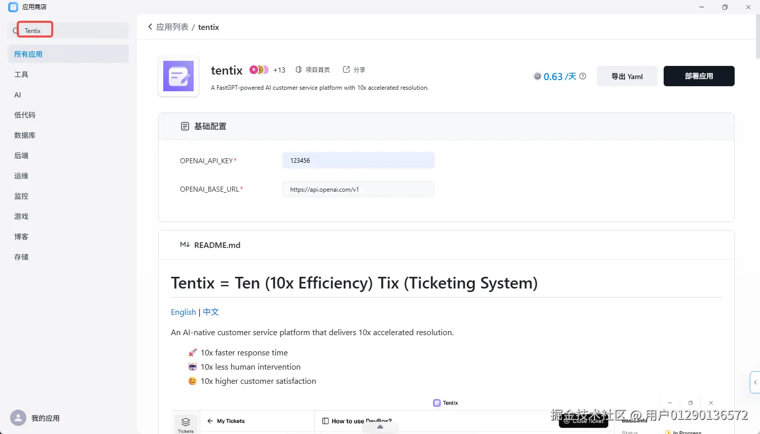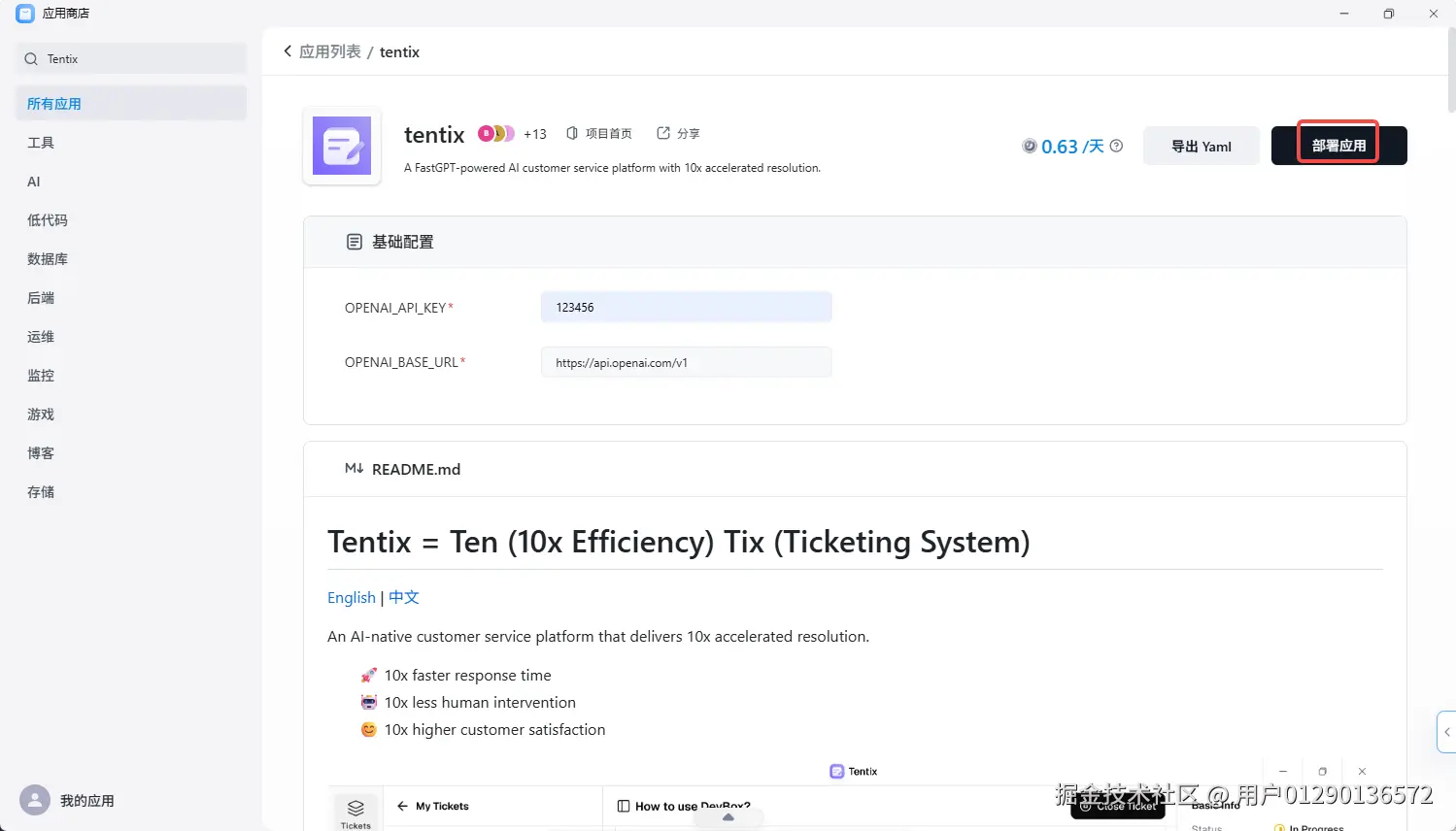 我点击进入 Tentix 的详情页,看到右上角的“部署应用”按钮就直接按了下去。不需要配置任何东西,Sealos 会自动帮我搞定端口和存储。