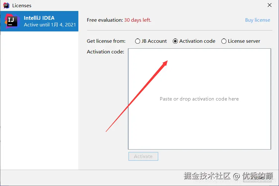 然后重启你的IDEA,点击IDE菜单 "Help" -> "Register..." 或 "Configure" -> "Manage License..."。选择Activation code,