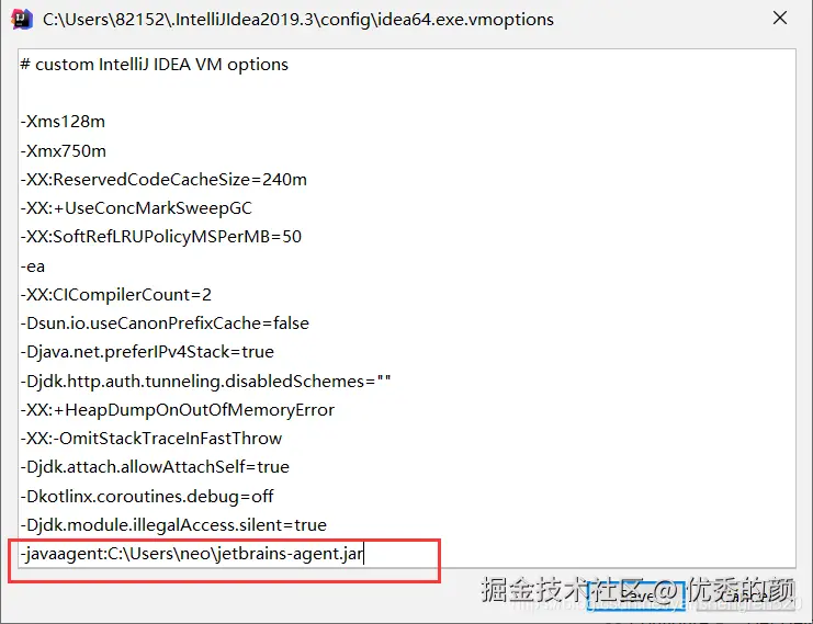 在打开窗口末行添加:jetbrains-agent.jar包所在的路径位置,这个包可以到我的公众号中获取。根据不同的操作系统进行选择,我这是针对windows系统操作。