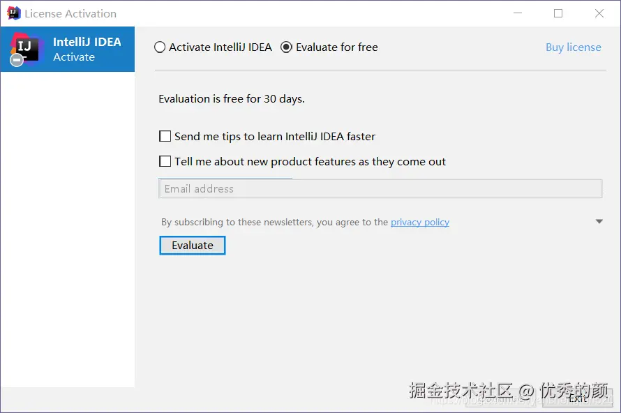 如果上来就需要注册,选择试用(Evaluate for free)进入IDEA,然后点击Evaluate,进入。