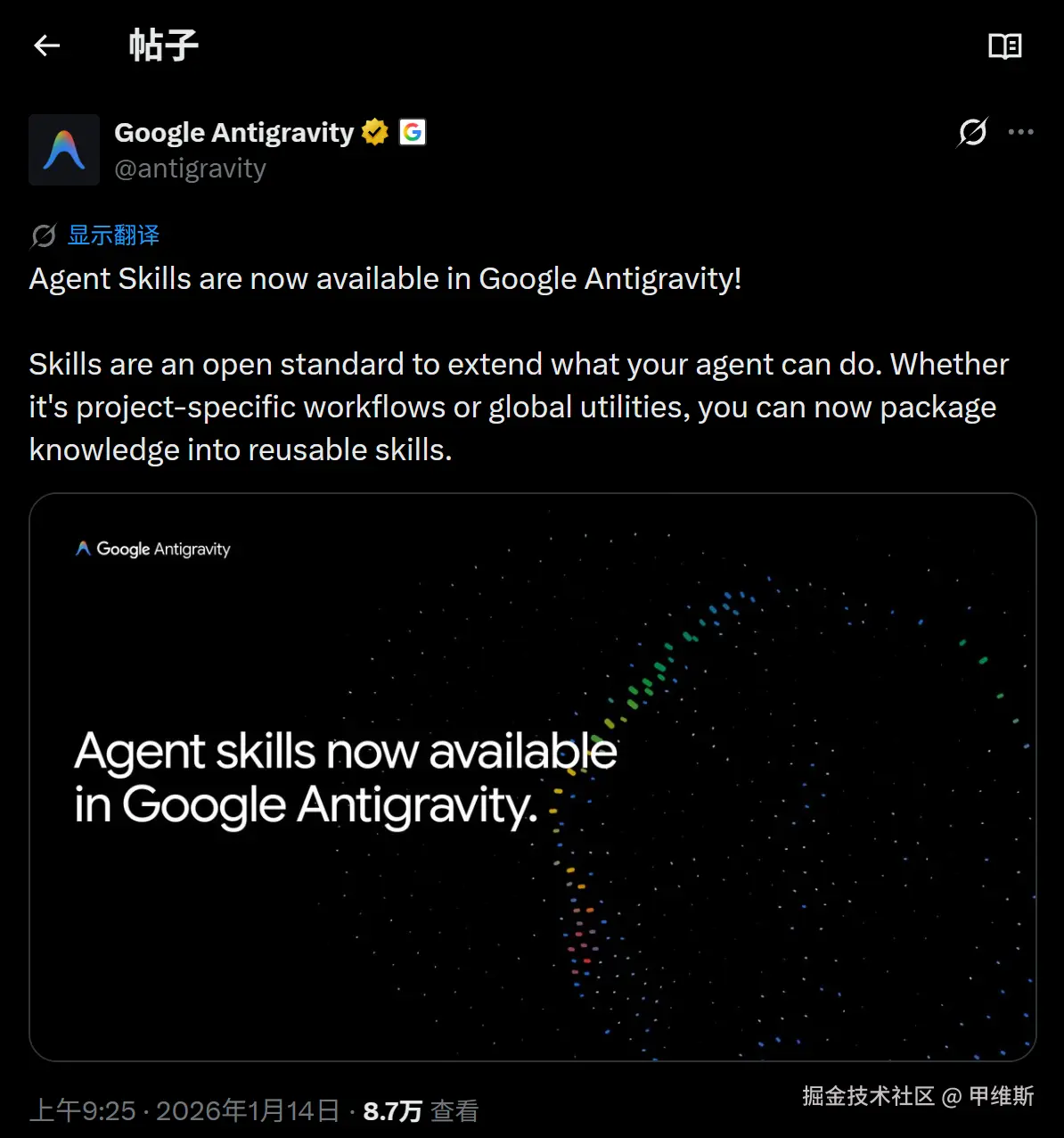 Google Antigravity 官方账号今天发了 一条推特。表示"Antigravity 也支持技能了"
