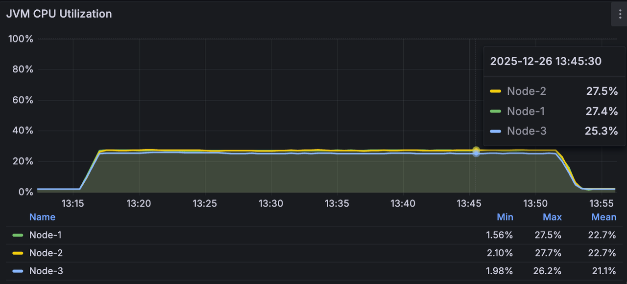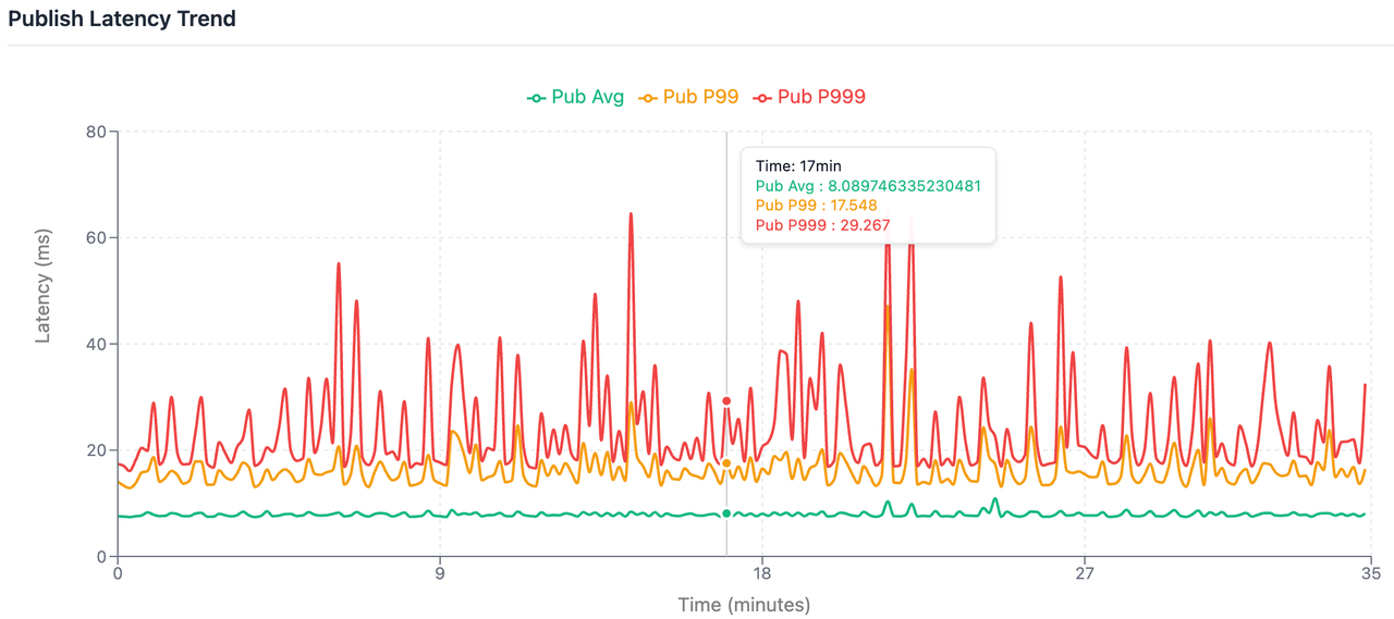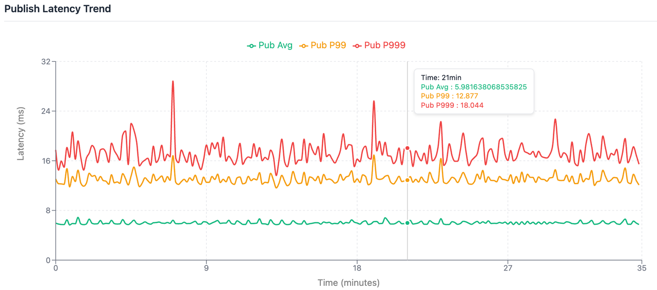 linger.ms=3),并模拟集群满负载运行状态。此场景旨在验证在真实业务压力下,AutoMQ 是否能提供高确定性的延迟输出,并观察其在处理海量小包写入(High TPS)时的尾部延迟(P99/P999)表现。