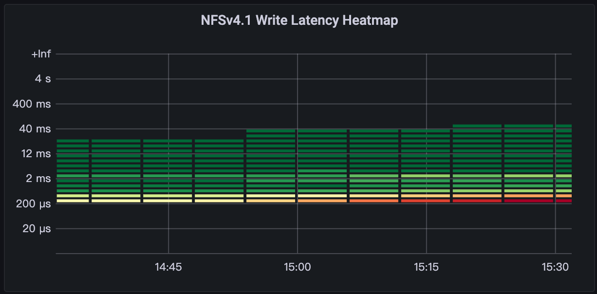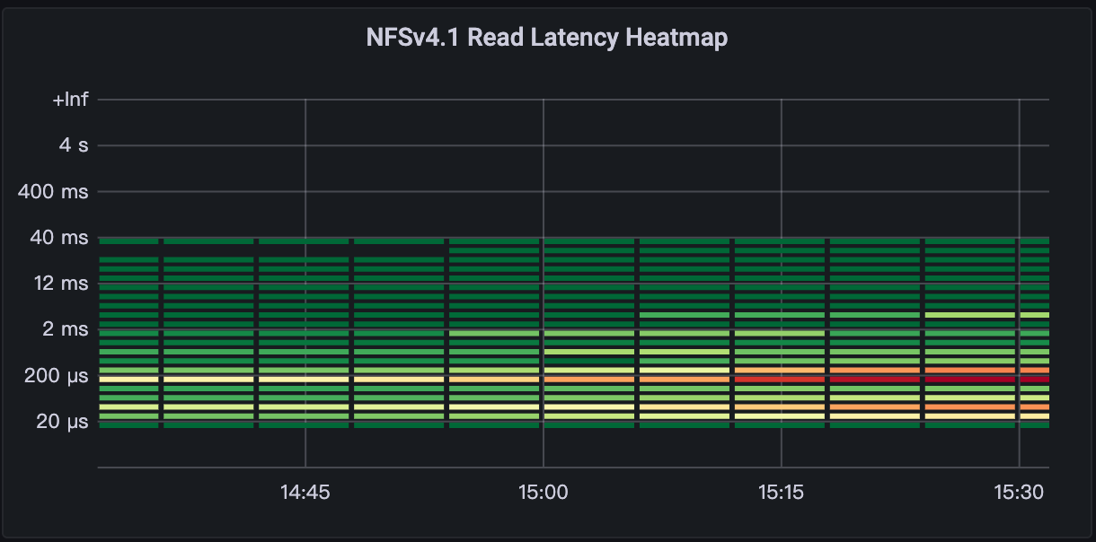 下面两张图是 AutoMQ 采用 FSxN WAL 运行一小时进入稳态后的写入/读取延迟热力分布情况。一开始由于样本数还不够多,我们还不能完整看到读写请求的延迟集中分布在哪些区间。在运行 1 小时以后,我们可以看到90%的写入响应都在 1ms 以下,同时 91%的读取都在 1ms 以下。