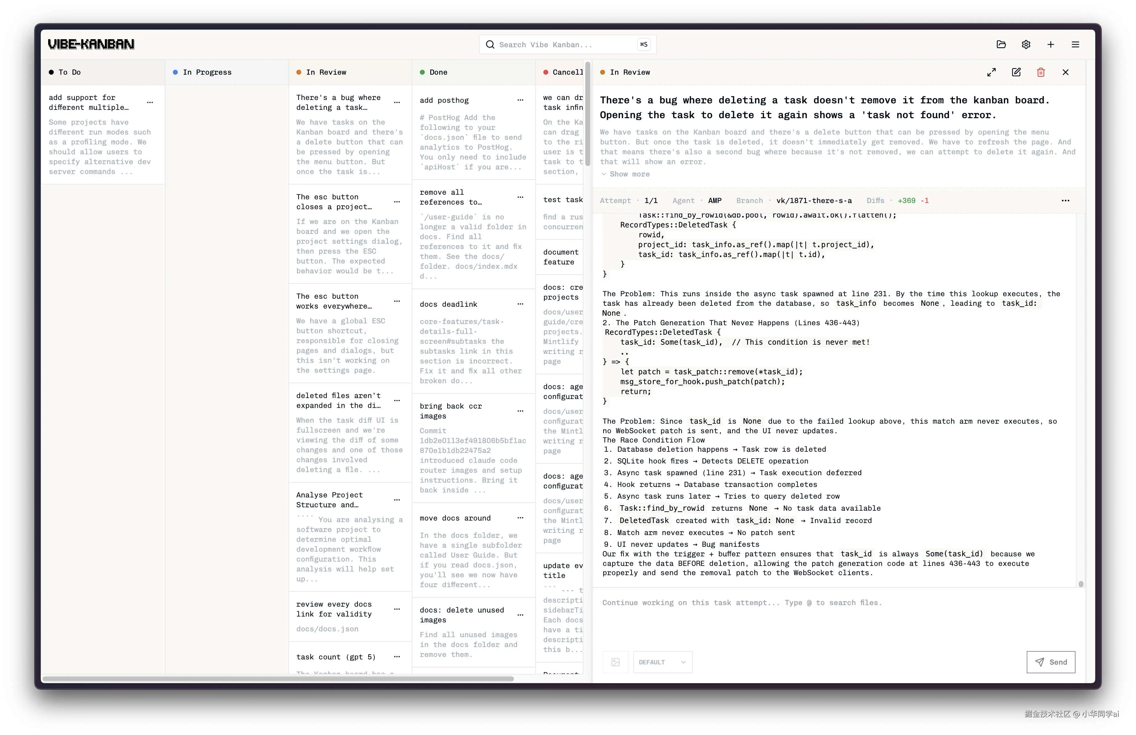 最近我在用一个开源工具叫 Vibe Kanban: 它把 AI coding agent 变成看板里的“工位”,你可以同时跑多个 agent,任务彼此用 git worktree 隔离,不会互相踩文件。([Vibe Kanban][2]) 跑完以后直接在网页里看 逐行 diff,像 code review 一样给评论,再把反馈丢回去让 agent 修到你满意。([Vibe Kanban][2])
