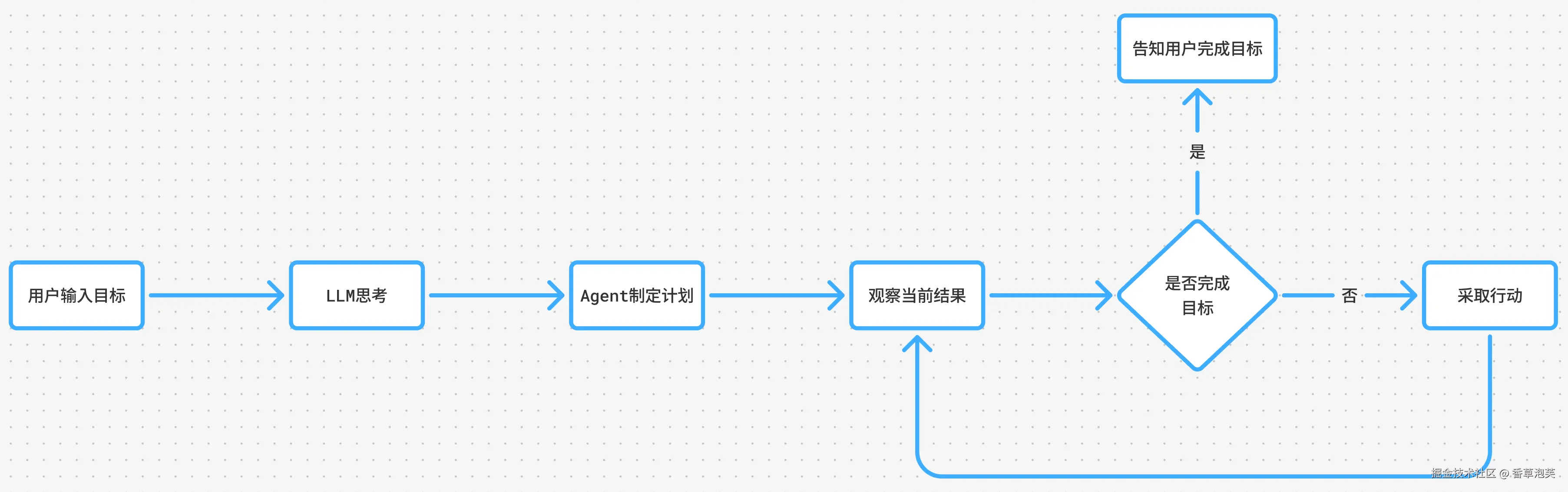 在该流程中,用户首先输入目标,LLM 随即理解其意图并制定实现目标的计划。随后,Agent 会先观察当前状态是否已达成目标;若未完成,则执行相应行动——通常表现为调用外部工具(如搜索、预订、计算等)。接着,Agent 再次观察执行结果,并重复“观察—行动”循环,直至目标达成。这一“思考—计划—执行—反馈”的闭环机制,正是 AI Agent 的核心运行逻辑。
