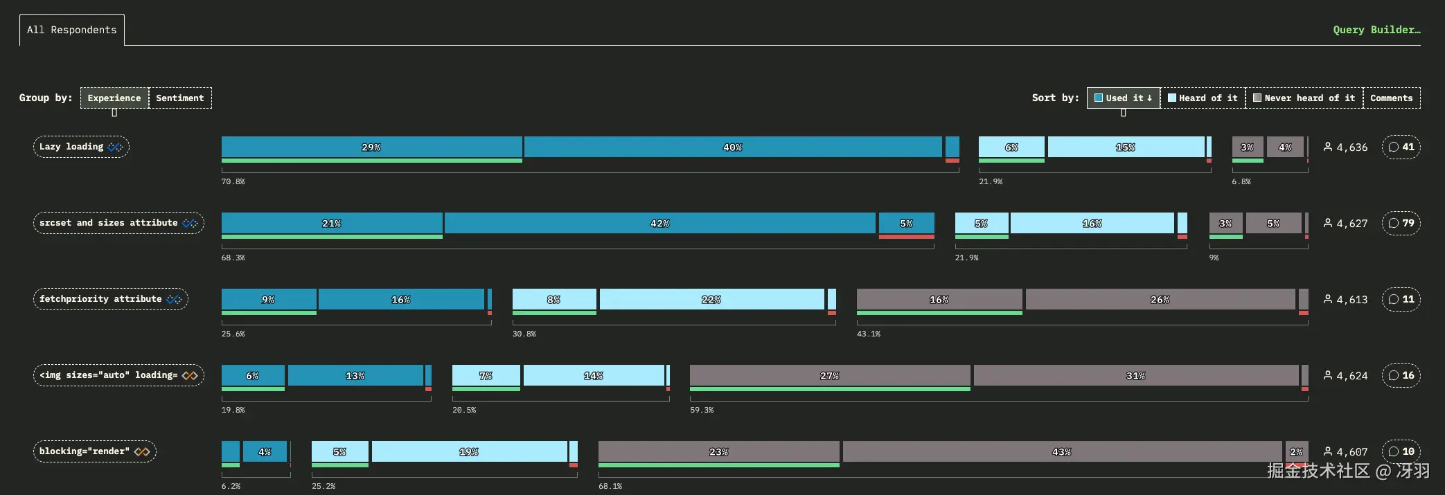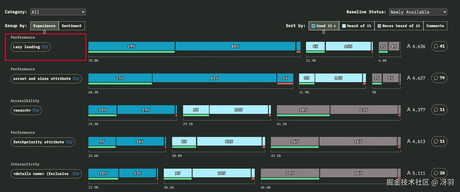 使用过延迟加载的受访者比例高达 70%,是“新可用(Newly Available)”功能中最常用的功能。