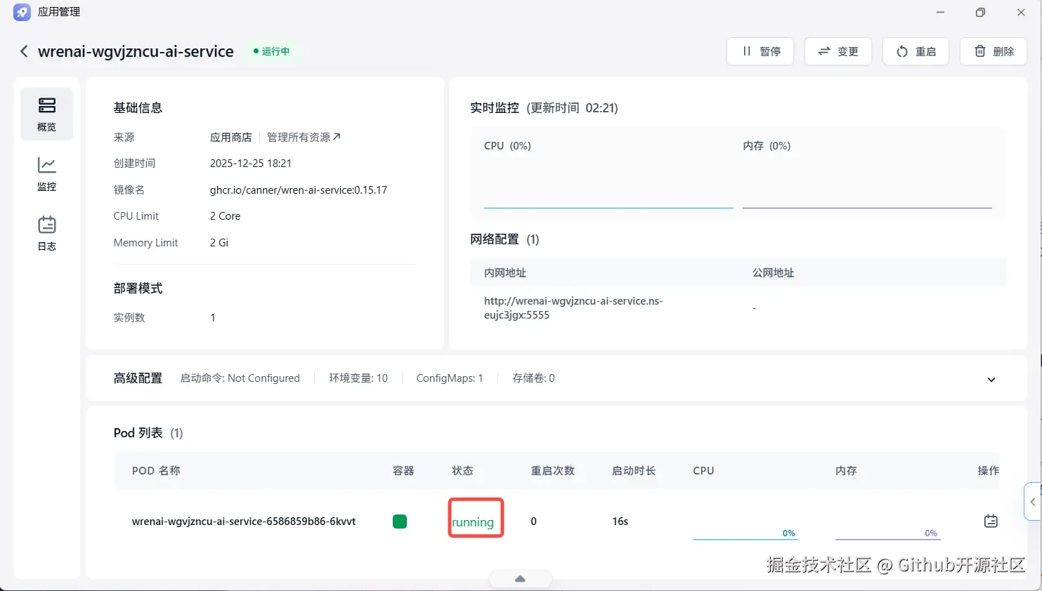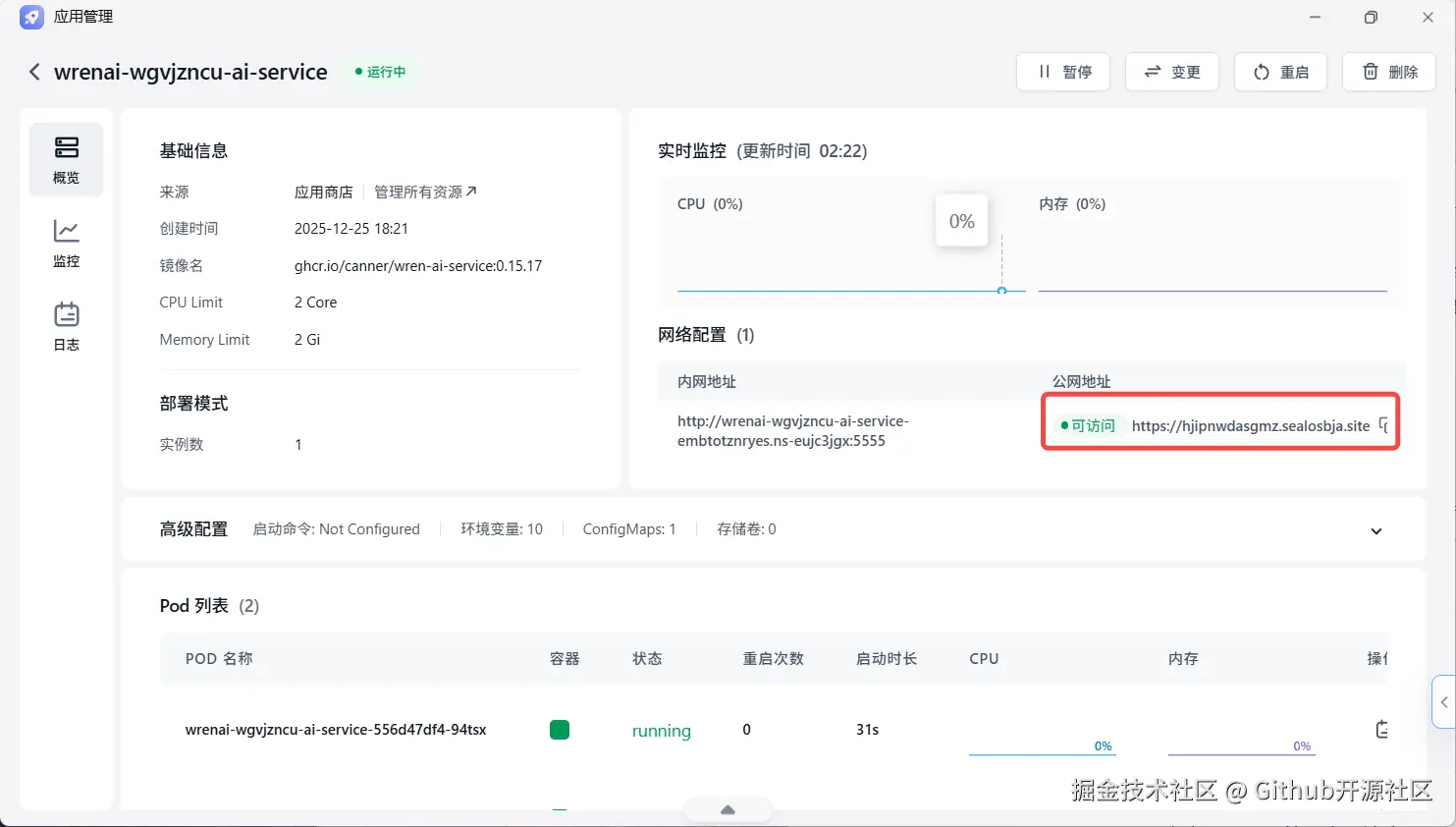 Sealos 的自动化流程开始启动,它在后台完成了所有环境配置、依赖安装和服务整合。大约 3 分钟后,应用状态变为绿色的 Running。我的私人 AI 数据分析师正式上岗!