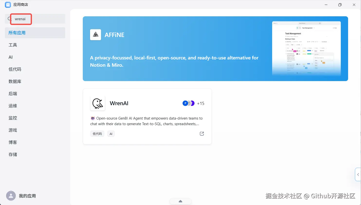 在搜索框输入 wrenai,找到了这个强大的 AI 工具。