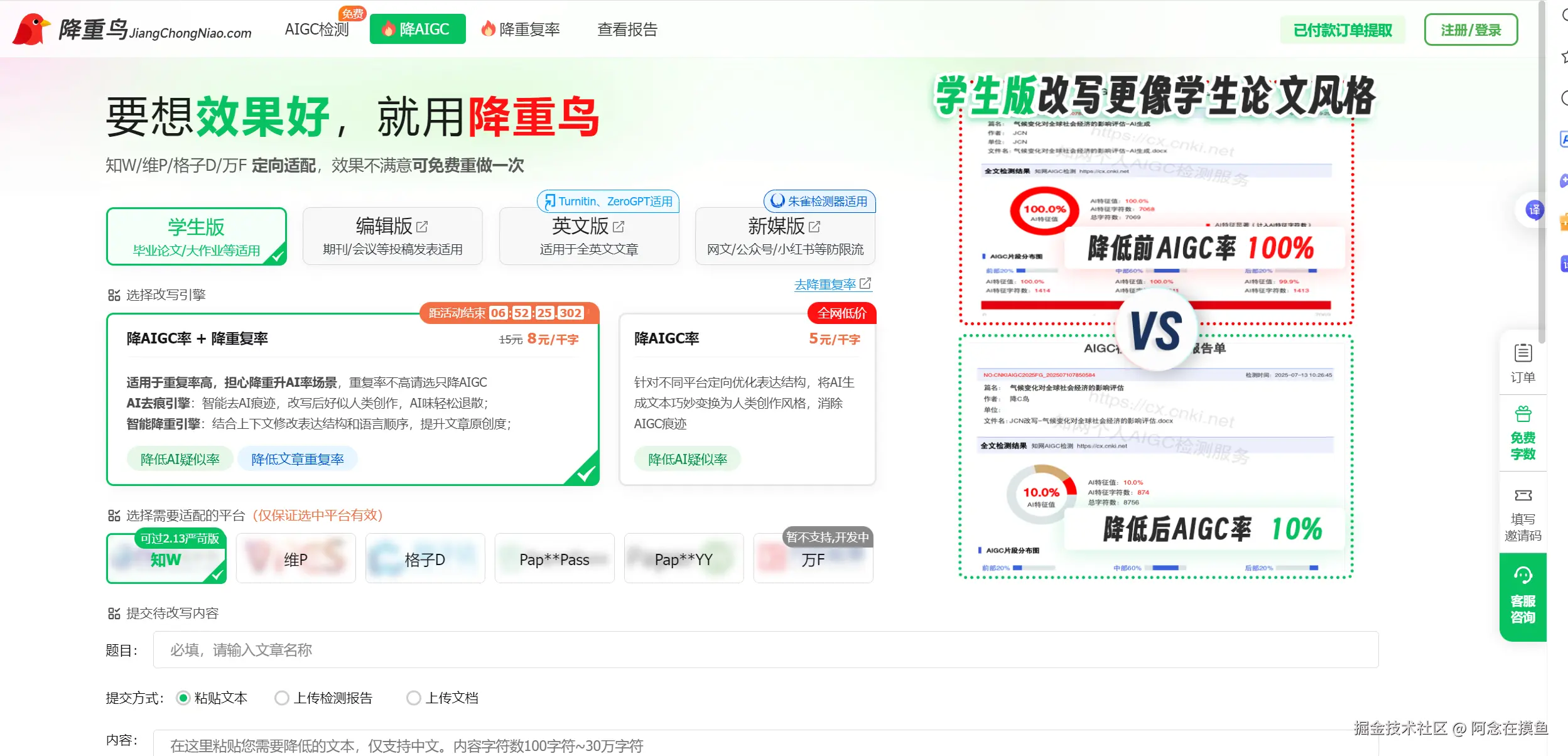 懒人比较喜欢用这个,因为它主打一站式。这边查重查出AI率高了,那边直接点一下就能用它的 降ai率工具。对于不想在不同网站之间切来切去的人来说,确实方便。而且它经常搞活动,算半个 免费降ai率工具,能薅羊毛。