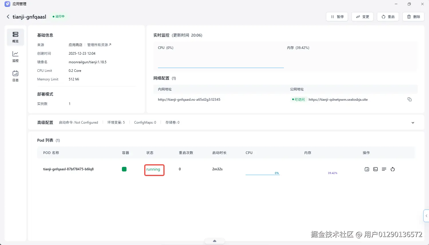 大约 2分钟 后,应用状态就变成了绿色的 Running。我的 All-in-One 网站分析与监控平台,就这么轻松地搭建完成了。