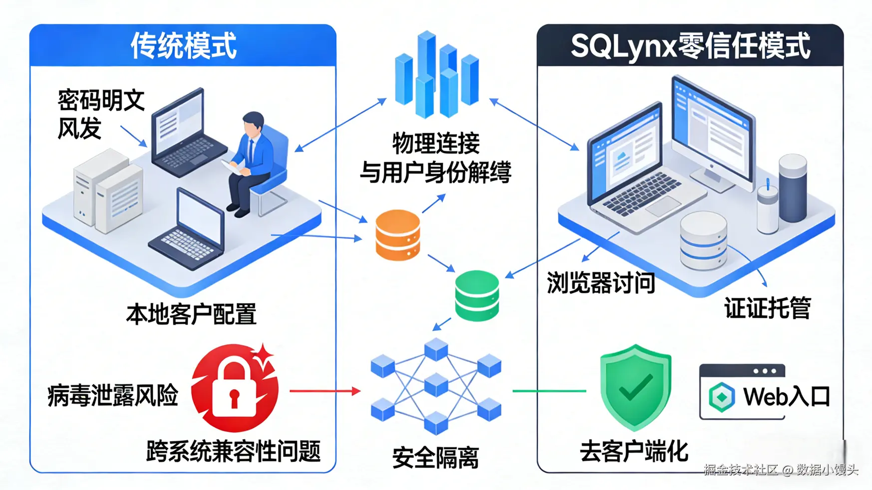 SQLynx 通过 Web 架构 与 凭证托管 机制彻底解决了这一痛点: