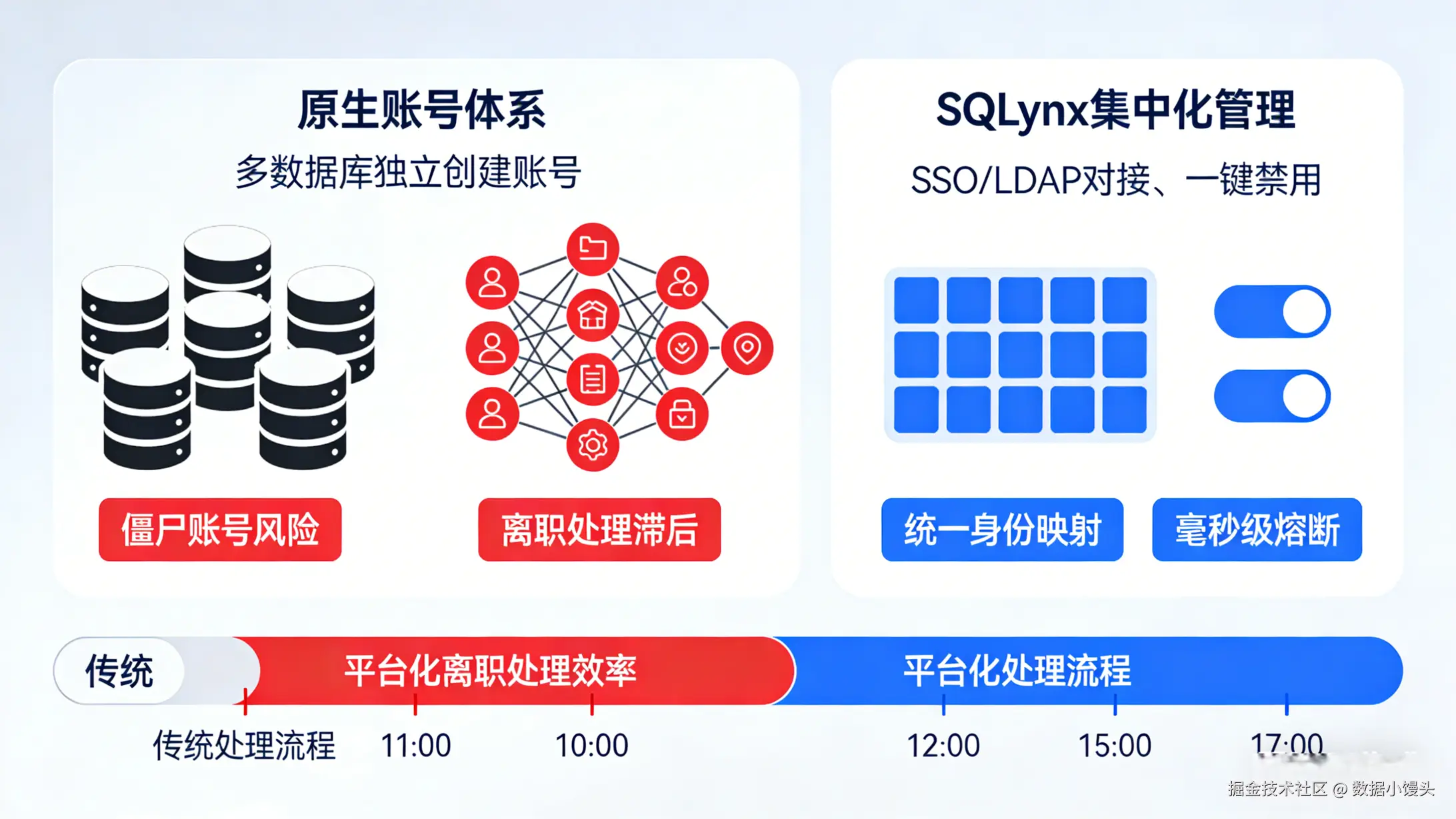 在微服务架构下,一个企业可能拥有数十甚至上百个数据库实例。如果沿用传统的数据库原生账号体系,管理员需要为每位员工在每个数据库中创建账号,入职和离职的工作量呈指数级增长,且极易出现漏删的“僵尸账号”。