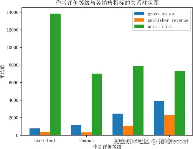作者评价等级与销售表现的柱状图(图3-12),清晰展示了不同评级作者在总销量、总销售额、出版商收入三个维度的表现差异,核心分析结论如下: