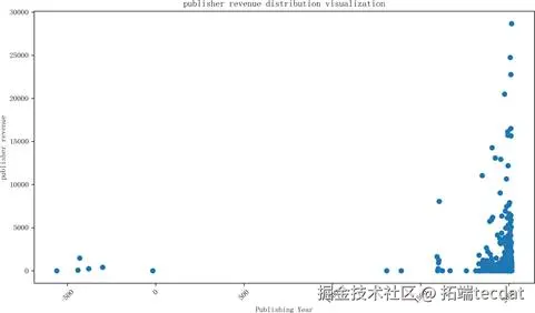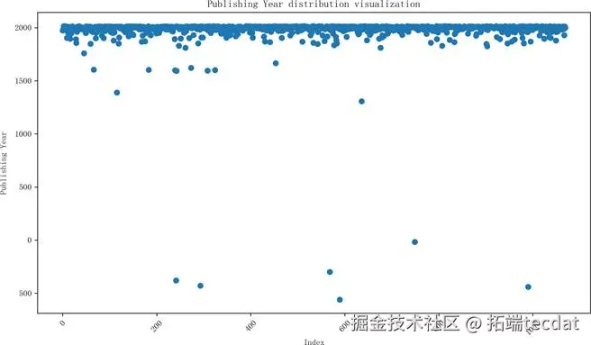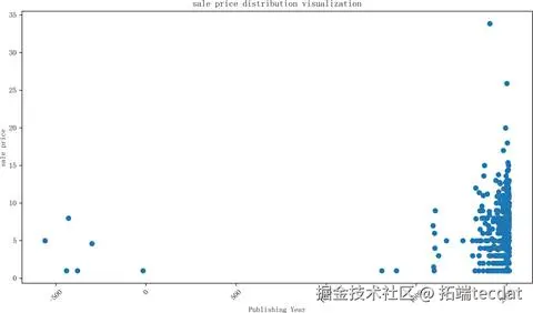 从出版年份的散点图(图3-2)可以清晰看出,数据集中的书籍出版年份呈现出明显的集中特征:大部分书籍的出版年份集中在2000年前后,仅有极少数古籍类书籍的出版年份标注为公元前。这一特征与线上图书销售平台的实际库存结构高度契合,即平台以近现代出版物为主,古籍类书籍仅占极小的市场份额。