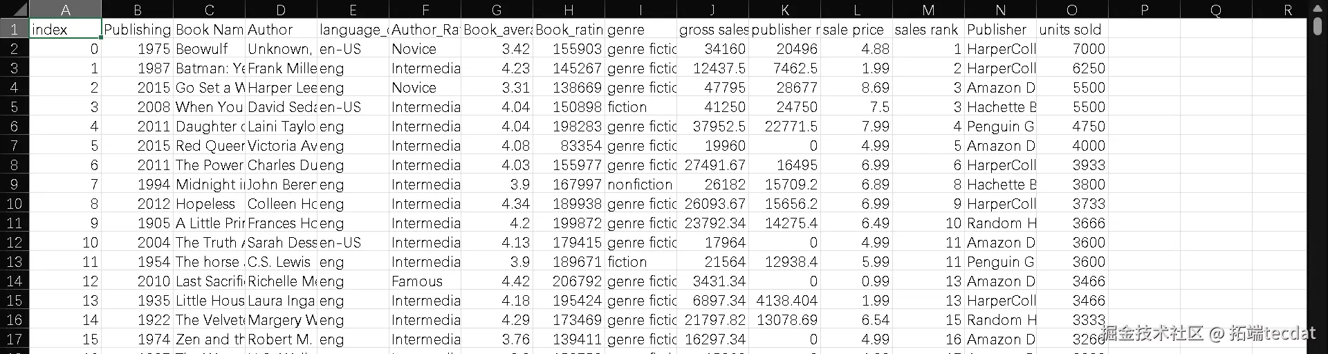 - 按出版年份对数据集进行升序排列,便于开展书籍销售的时序特征分析。