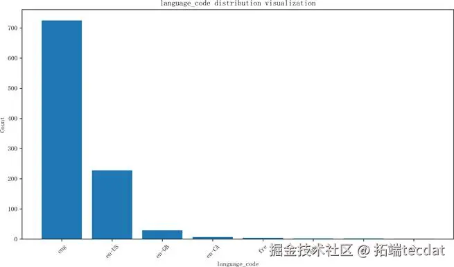 语言编码的直方图(图3-3)显示,数据集中的书籍语言呈现出高度集中的特点:通用英语(eng)的书籍数量最多,约720本,占据绝对主导地位;美国英语(en-US)次之,约220本,为第二大语言类别;英国英语(en-GB)的书籍数量仅约30本,远低于前两者;其他语言的书籍数量则更少。这一分布结果反映出该线上销售平台的核心品类为英语类书籍,契合平台的用户受众特征。