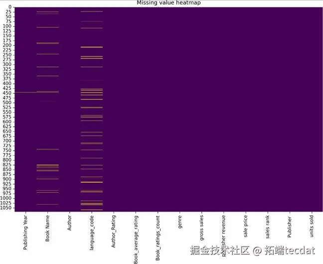 为保障后续分析的准确性,首先对数据集的缺失值情况进行检测。从缺失值热力图(图2-1)和缺失值统计表(表2-2)的结果来看,数据集整体完整性较好,大部分核心变量的缺失值数量为0,但部分变量存在少量缺失:其中语言编码(language code)的缺失值数量最多,在1070条初始数据中有53条缺失;书籍名称(Book Name)缺失23条;出版年份(Publishing Year)仅缺失1条。
