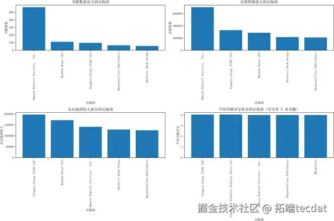 出版商综合分析图(图3-14)从书籍数量、销售额、出版商收入、书籍评分四个维度,展示了不同出版商的运营表现,核心分析结论如下: