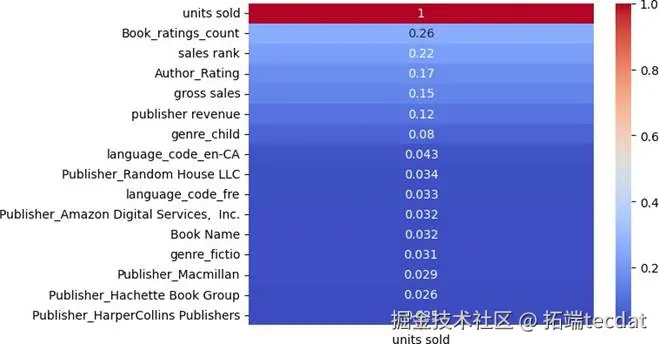 - 强相关性变量:总销量(units sold)与自身的相关性为1,这是必然结果;书籍评分数量(Book ratings count)与总销量的相关系数为0.26,销售排名(sales rank)与总销量的相关系数为0.22,这两个变量与总销量呈现相对较强的正相关关系,说明书籍的评分数量越多、销售排名越靠前,其总销量往往越高。