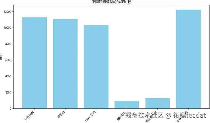 不同回归模型的RMSE值对比图(图4-19)显示:随机森林和梯度提升树的RMSE值在所有模型中最低,说明这两个模型的预测精度最高,预测值与真实值的偏差最小;线性回归、岭回归、Lasso回归的RMSE值处于中等水平,预测误差相对较大;支持向量机的RMSE值最高,预测精度最差,进一步验证了该模型不适用于本数据集的销量预测。