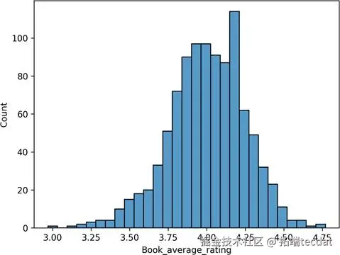 - 书籍平均评分呈现双峰分布特征,峰值分别位于3.5分与4.5分左右,表明书籍在质量与受众认可度上存在两极分化,低评分书籍多因内容质量、题材小众等原因导致认可度低,而高评分书籍则凭借优质内容、知名作者等优势获得读者青睐。