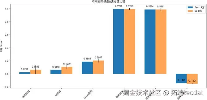 不同回归模型的R²值对比图(图4-18)显示:随机森林和梯度提升树的R²值在所有模型中处于最高水平,且测试集与交叉验证的R²值均接近1,说明这两个模型对在线书籍销售数据的拟合效果极佳,模型的稳定性与泛化能力较强;线性回归、岭回归与Lasso回归的R²值相对较低,表明这类线性模型对数据的拟合能力有限,难以捕捉变量之间的非线性关联;支持向量机的R²值为负数,说明该模型在本数据集上的预测效果极差,甚至不如采用均值进行预测。