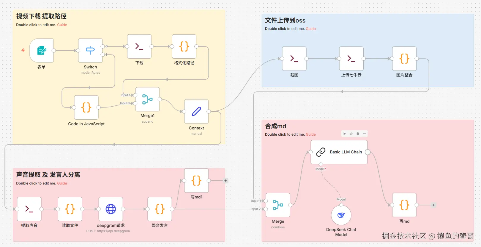 音频线:提取音频 -> Deepgram (语音转文字 + 角色分离) -> 文本清洗。