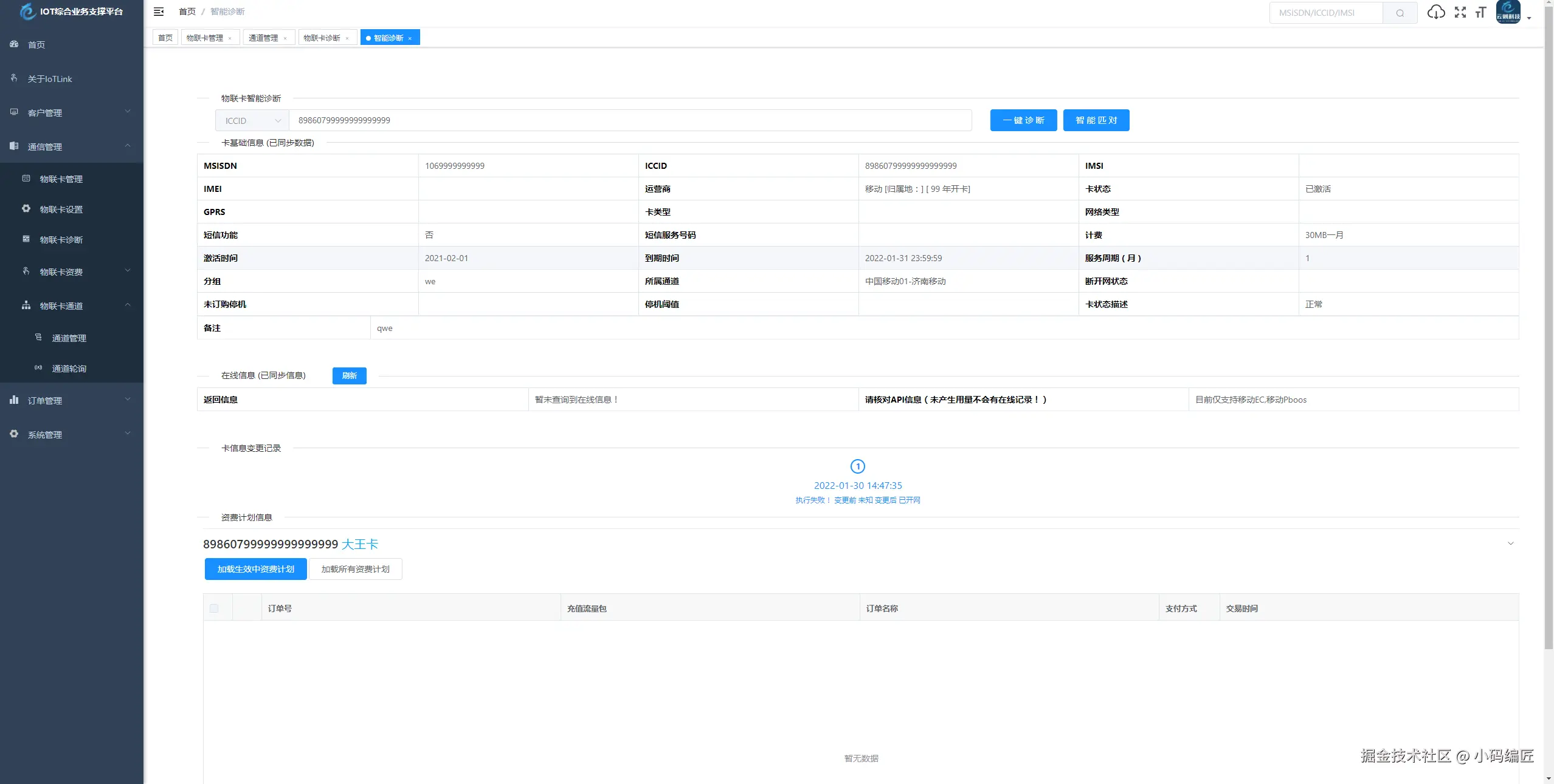 8、诊断及账单:对物联卡进行智能诊断,并提供详细的账单信息。
