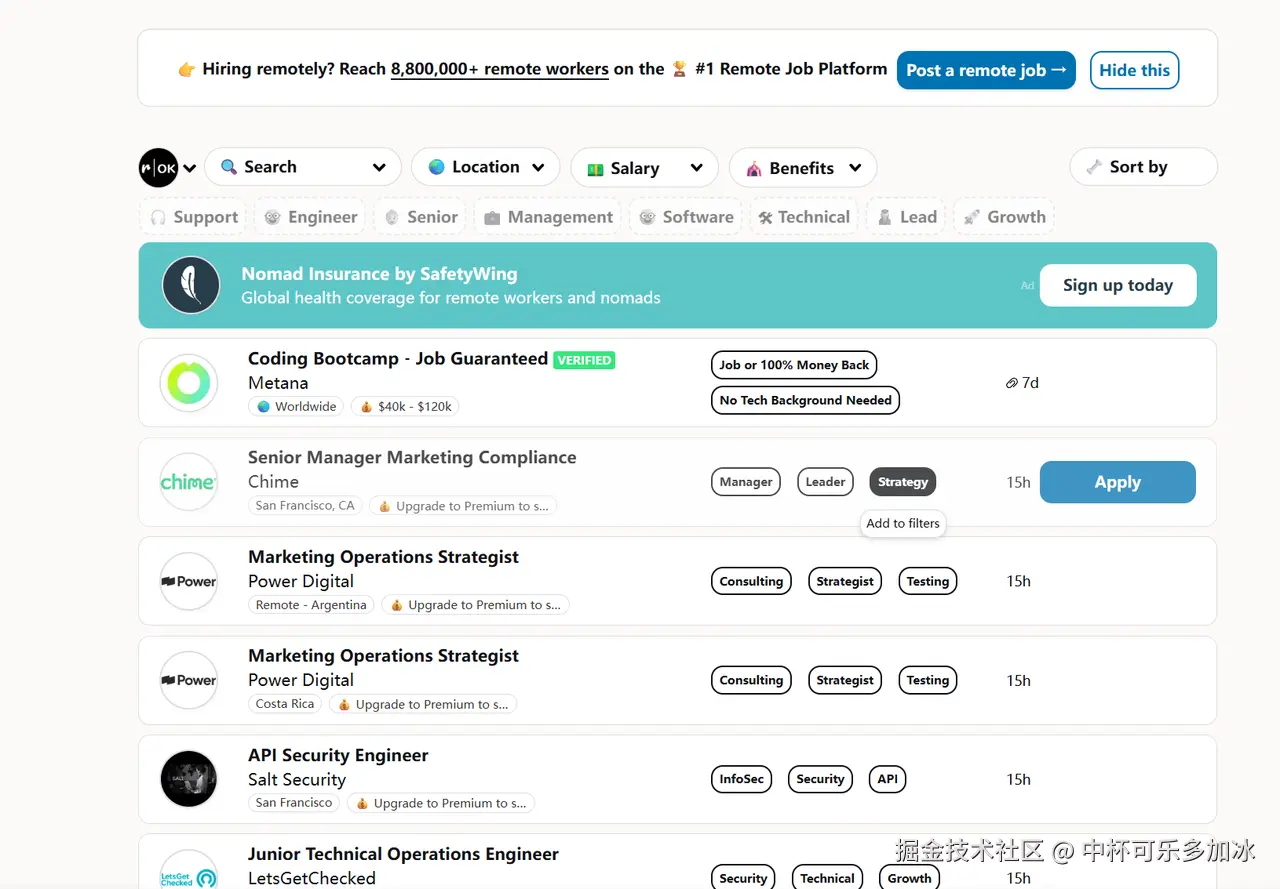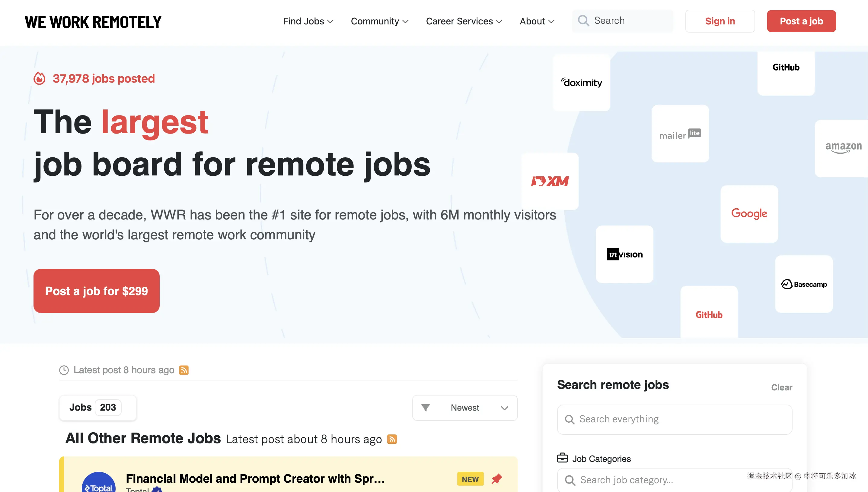 RemoteOK 更像远程技术工作的集合站,上面有大量远程兼职、短期合约项目。对程序员接单来说,它的好处是项目相对正规,需求描述清晰,很多来自真实公司。