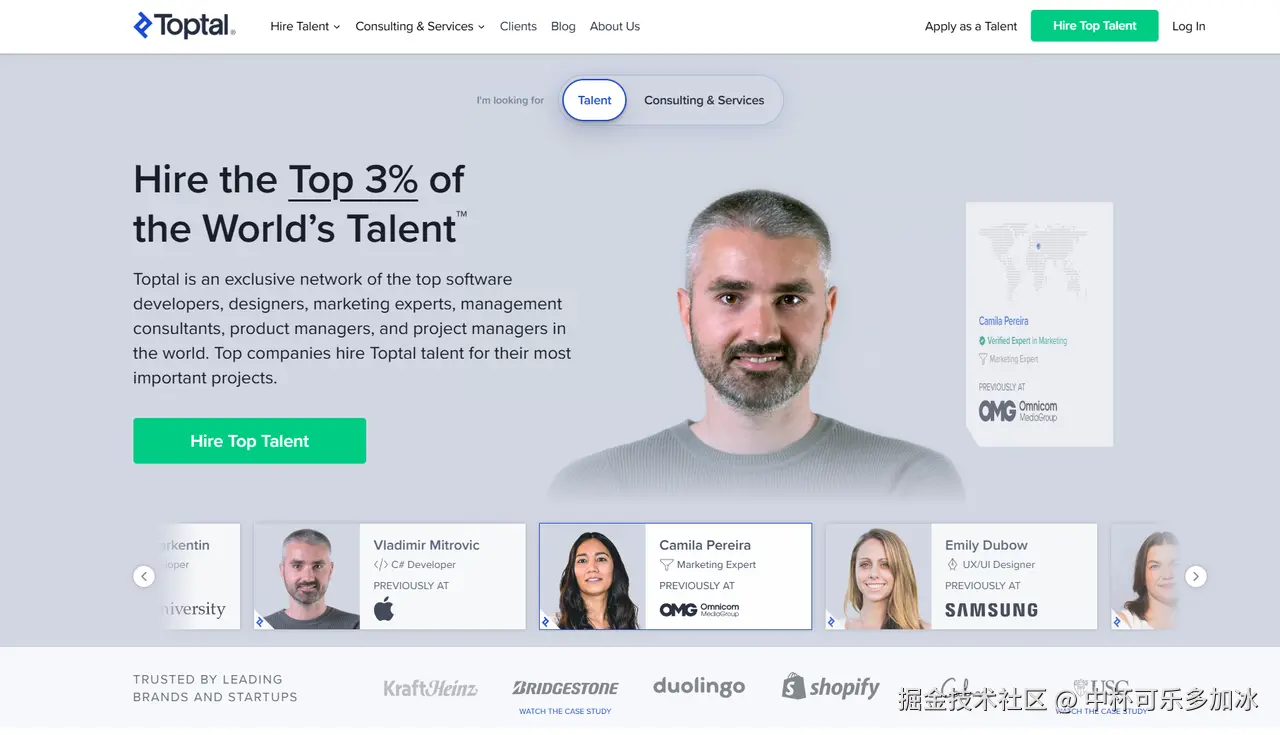 Toptal 的定位非常明确:只筛选少数高水平开发者。审核流程严格,但通过之后,项目质量和预算都明显高于普通平台。