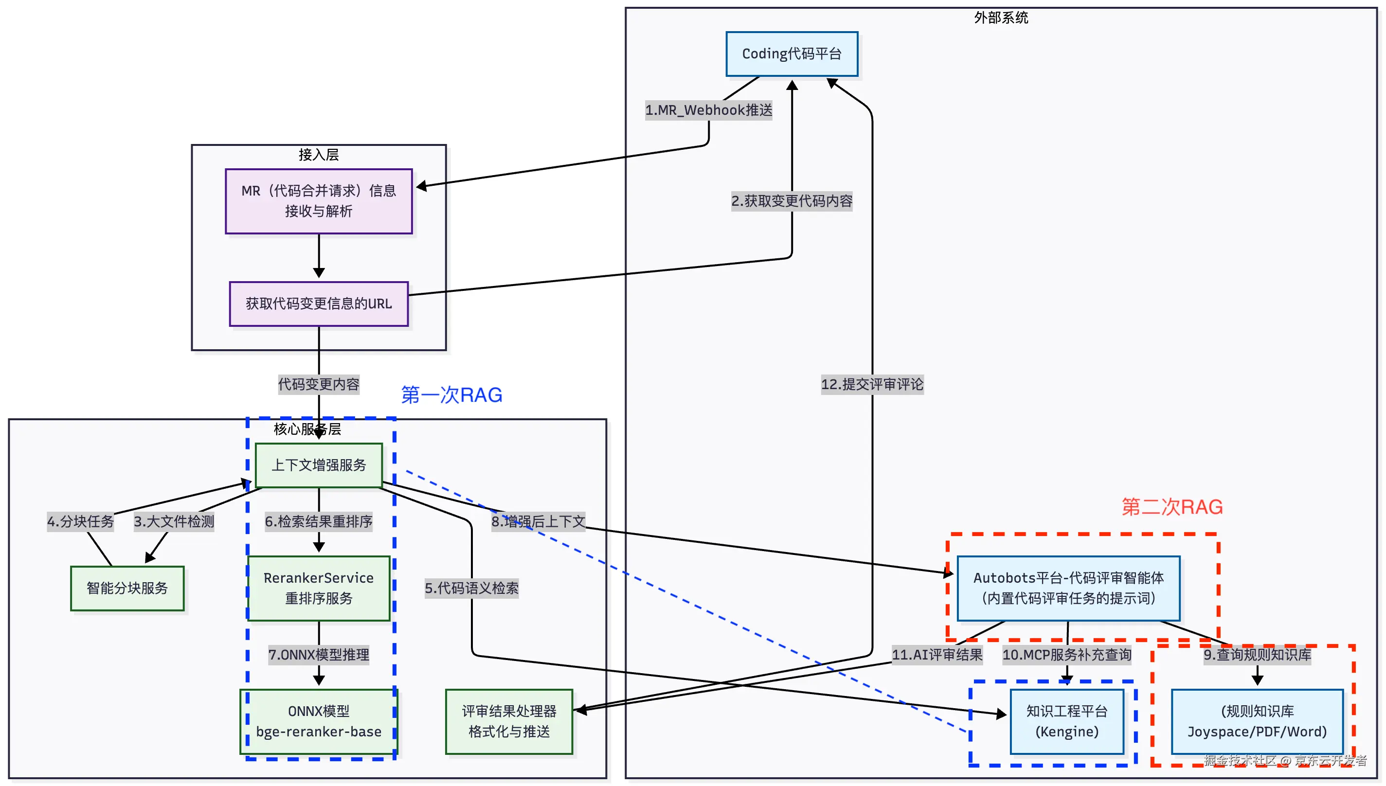 正是在此背景下,【供应链技术部-商家导入研发组】在AI代码评审方面进行了一些探索,尝试将知识工程代码知识检索能力与AutoBots(已更名为:JoyAgent)知识库检索能力相结合,构建了一套代码评审系统。这套双RAG架构为我们的代码评审工作提供了一些新思路,在此分享出来,希望与各位同行交流探讨,共同进步。
