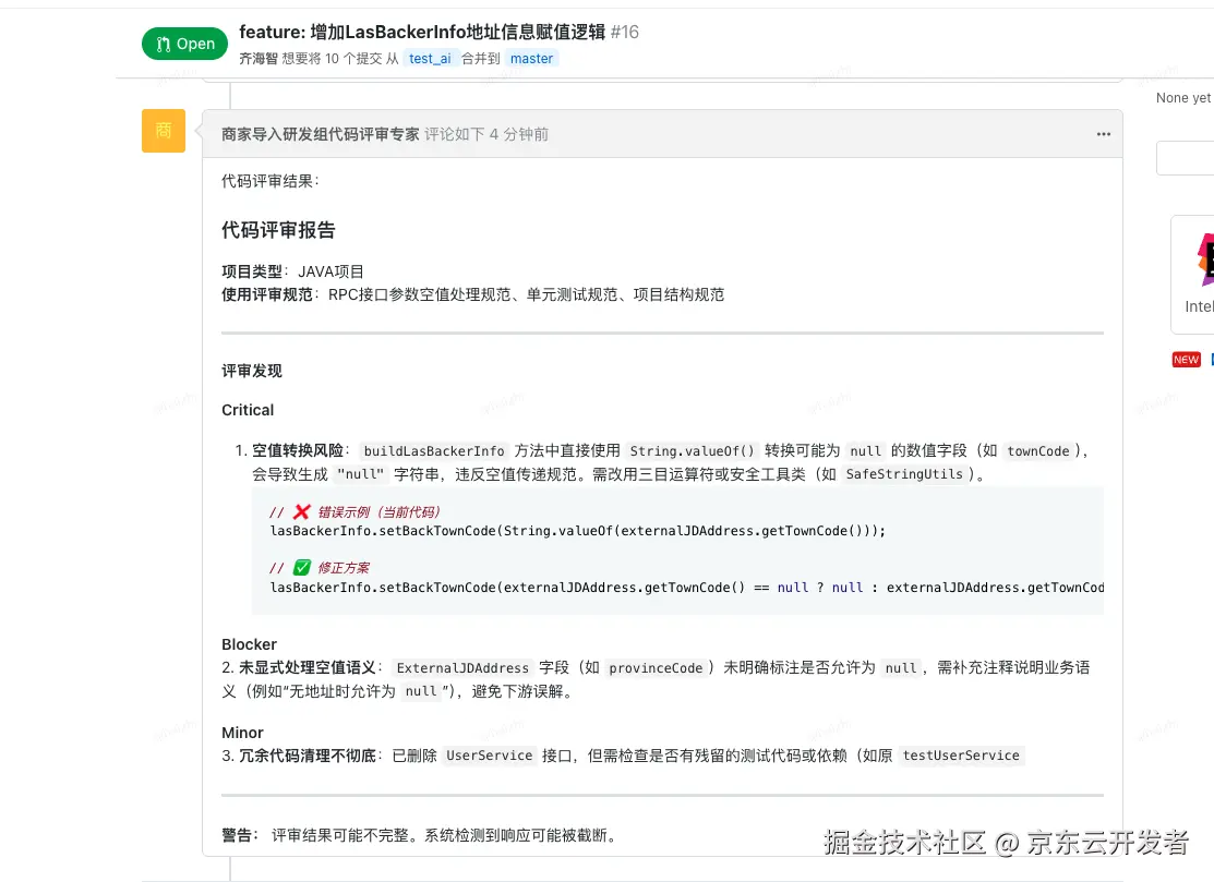 4.输出结果:直接使用JoyAgent的输出结果,通过coding平台API将评审结果添加到MR中。