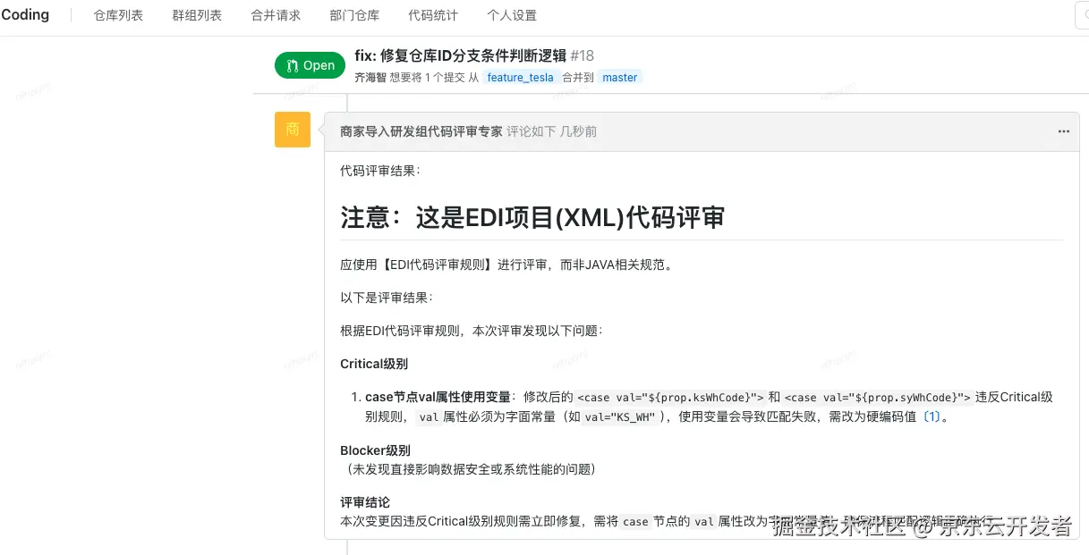 4.输出评审意见:解析大模型的返回结果,通过coding平台API将评审结果添加到MR中。