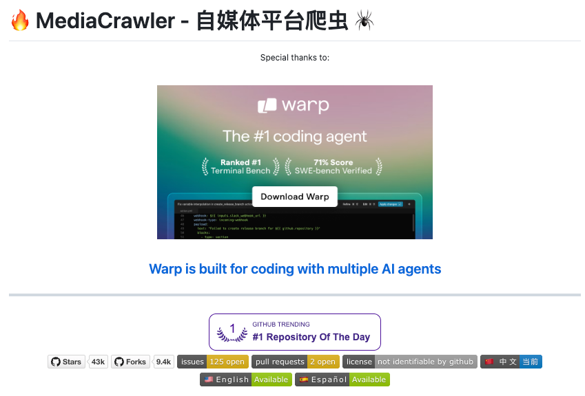 MediaCrawler: 42.6k stars 的全平台爬虫, 一套代码拿下自媒体平台爬虫数据