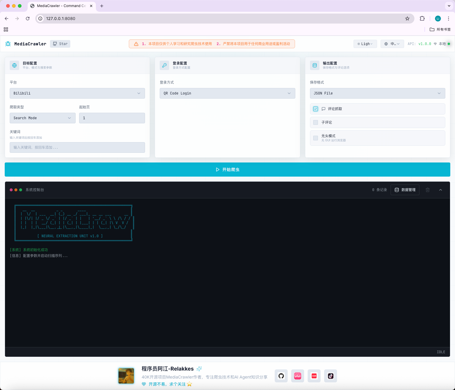 如果你在学习爬虫技术,可以从 media_platform/xhs/core.py 的请求拦截开始读起,那里有最直接的 Playwright 实战代码。但请记住:仓库里的 LICENSE 文件和这段免责声明同样重要。技术是开源的,但责任必须自负。