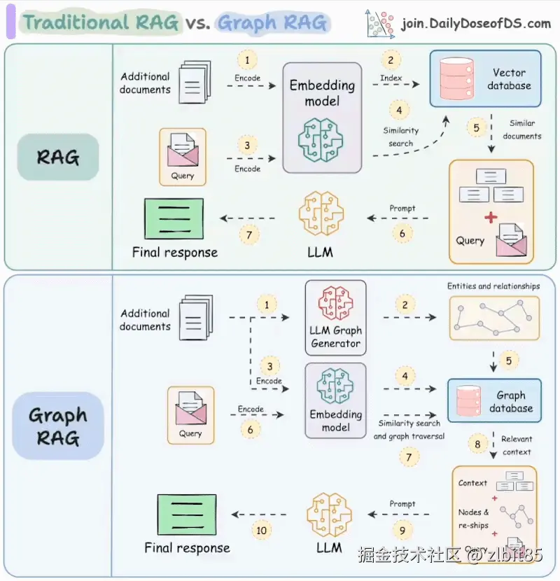 - 针对“信息以模糊文本呈现”的局限:传统RAG提供的是需要二次解读的自然语言片段,关系隐含其中。GraphRAG则先构建实体知识图谱,将知识转化为机器可直接处理的、确定性的关系结构。