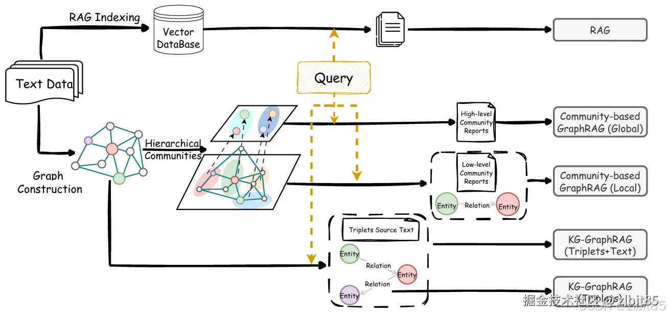 这个图是RAG、基于 KG 的 GraphRAG 和基于社区的 GraphRAG 的示意图(RAG vs. GraphRAG:系统评估与关键见解)。