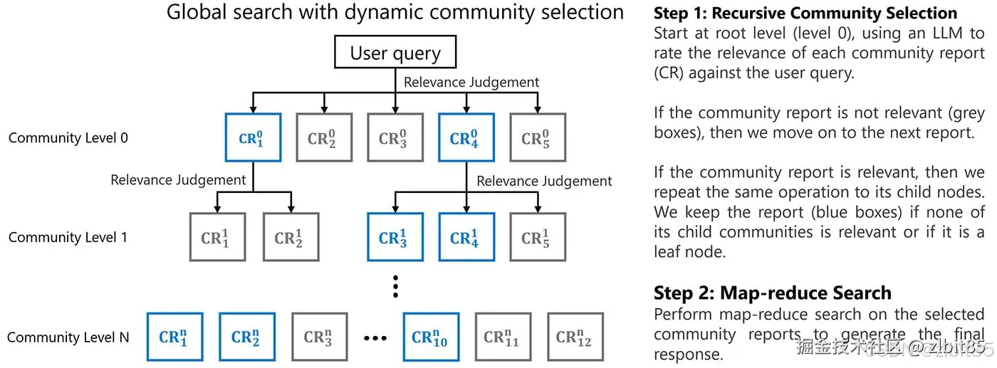 - 全局检索:根据查询语义,直接匹配和检索高层社区的摘要报告,获得全局性、概括性的语境。