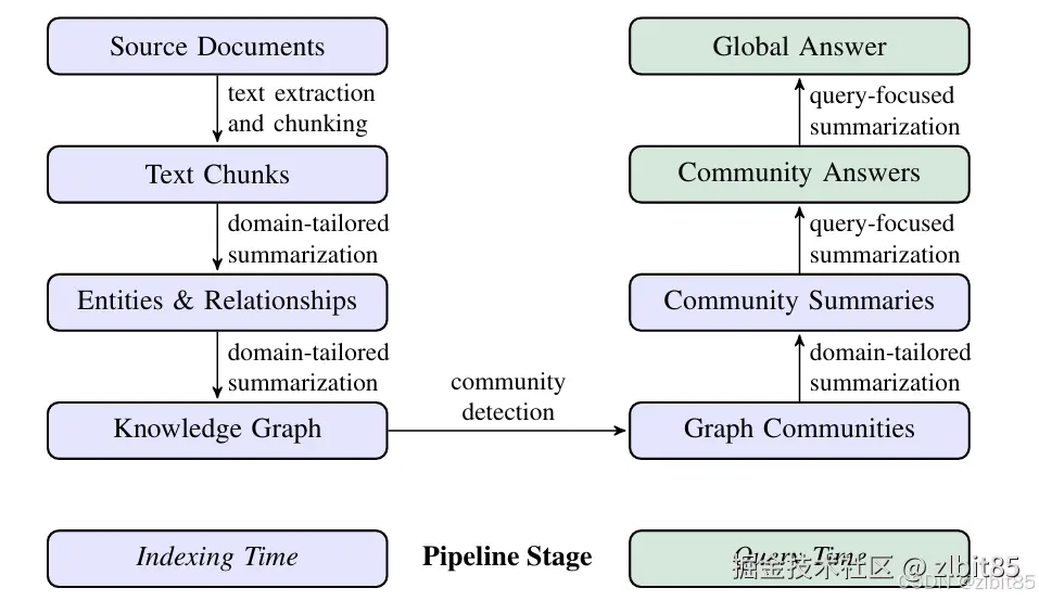 GraphRAG的基本流程如下图,分为两阶段:索引阶段和查询阶段(紫色块属于索引阶段,绿色块属于查询阶段)。