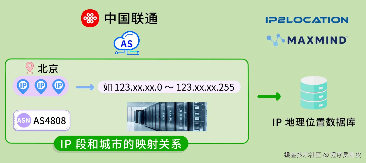 鱼皮:有更简单的方法。全球有很多专业的机构(如 MaxMind、IP2Location)专门收集并汇总了这些 AS 内部 IP 段和城市的映射关系,做成了 IP 地理位置数据库。