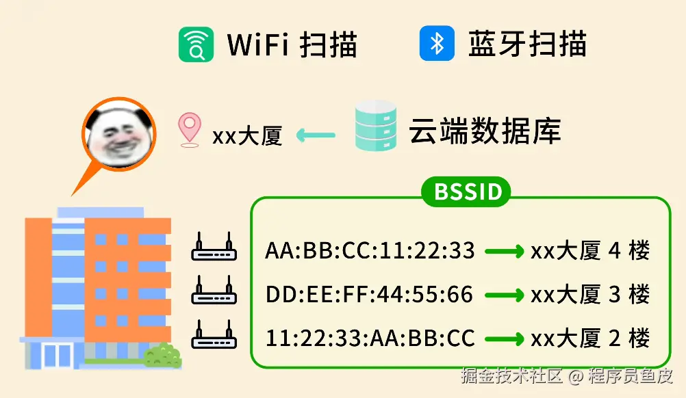 哪怕你关了 GPS,只要你开了 WiFi 或蓝牙扫描权限,APP 照样能定位。它们会扫描你附近几个 WiFi 的特征 ID(BSSID),然后去云端数据库一比对,发现你周围这几个 WiFi 都在某栋写字楼里,就能反推出你也在那里。