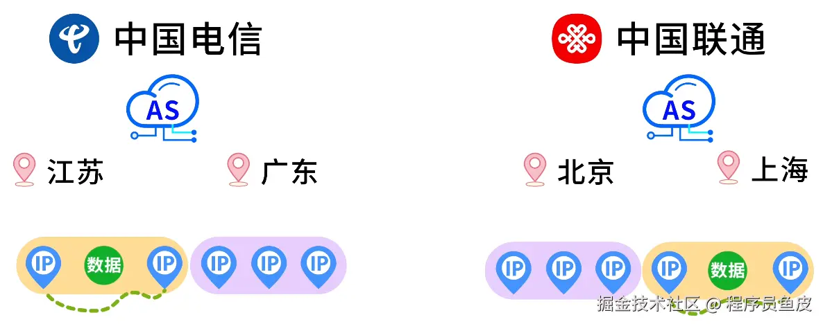 运营商在拿到这些 IP 后,会根据自己的机房部署,把不同的 IP 地址段划分给不同城市的网络设备。