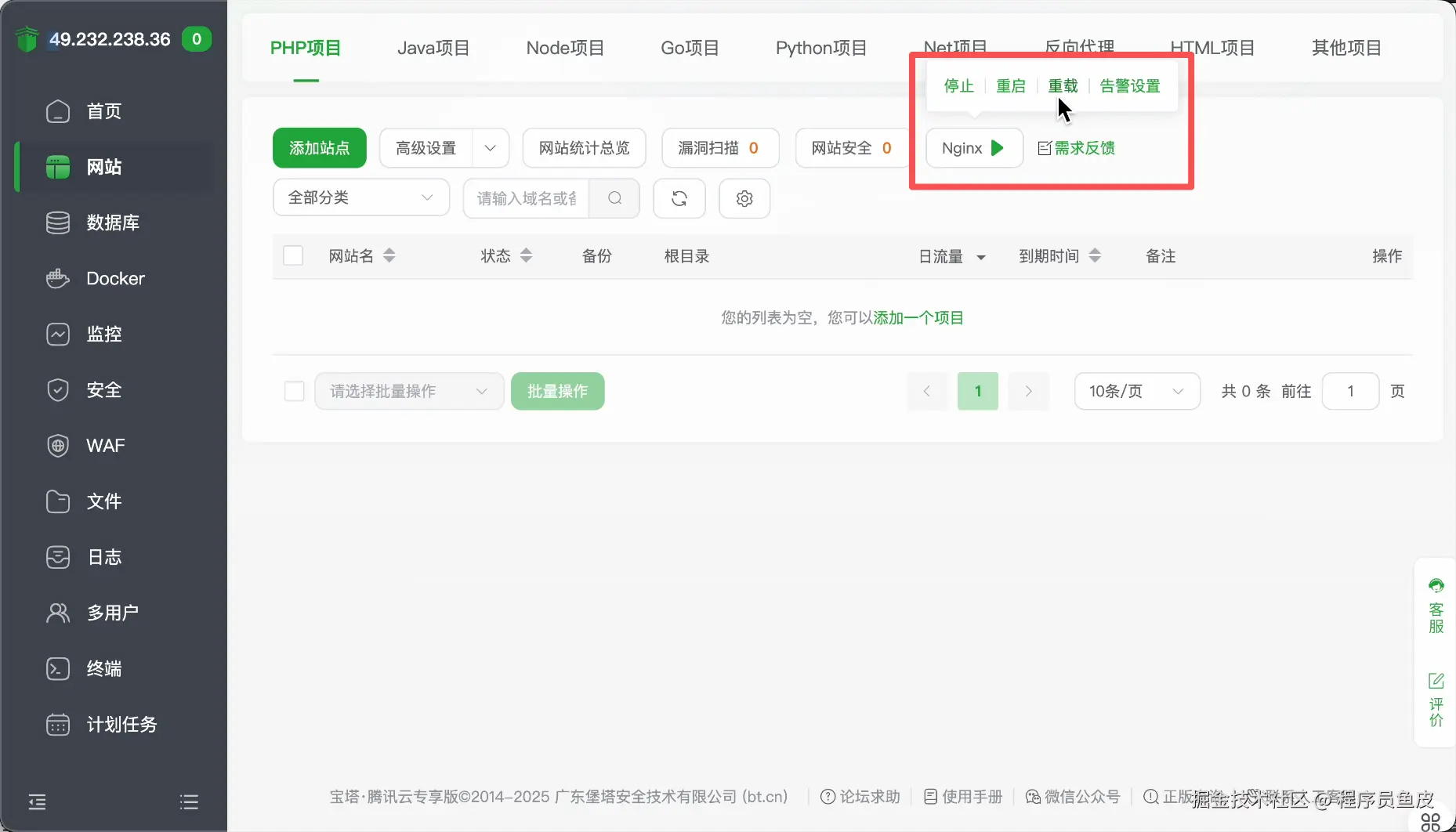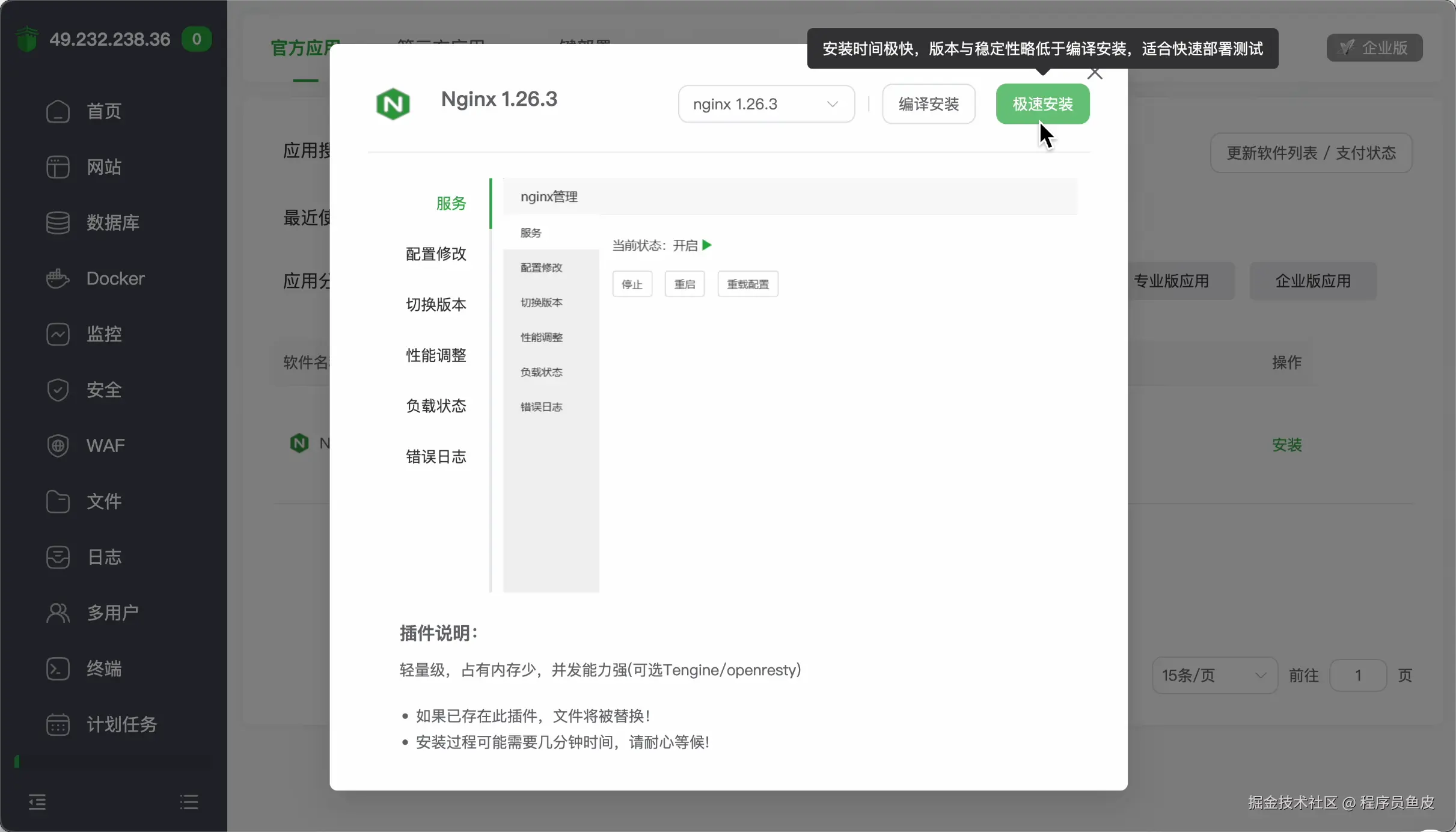 首先,我在服务器上安装 Nginx(这里利用了宝塔 Linux 面板极速安装):