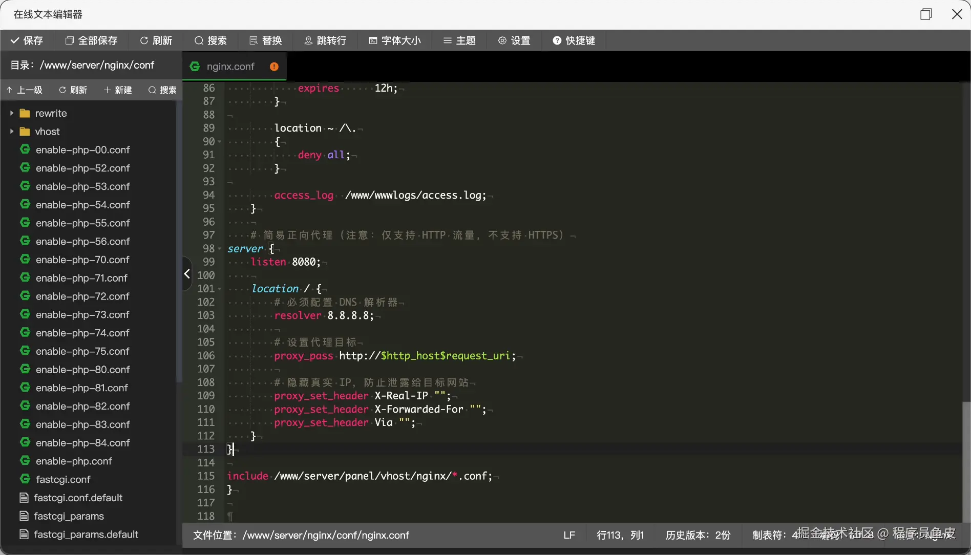 然后编辑配置文件 nginx.conf,配置一个简单的正向代理,也就是让你的请求通过代理服务器转发出去。