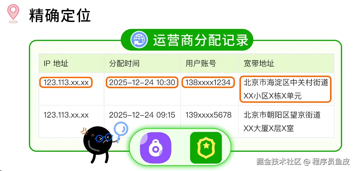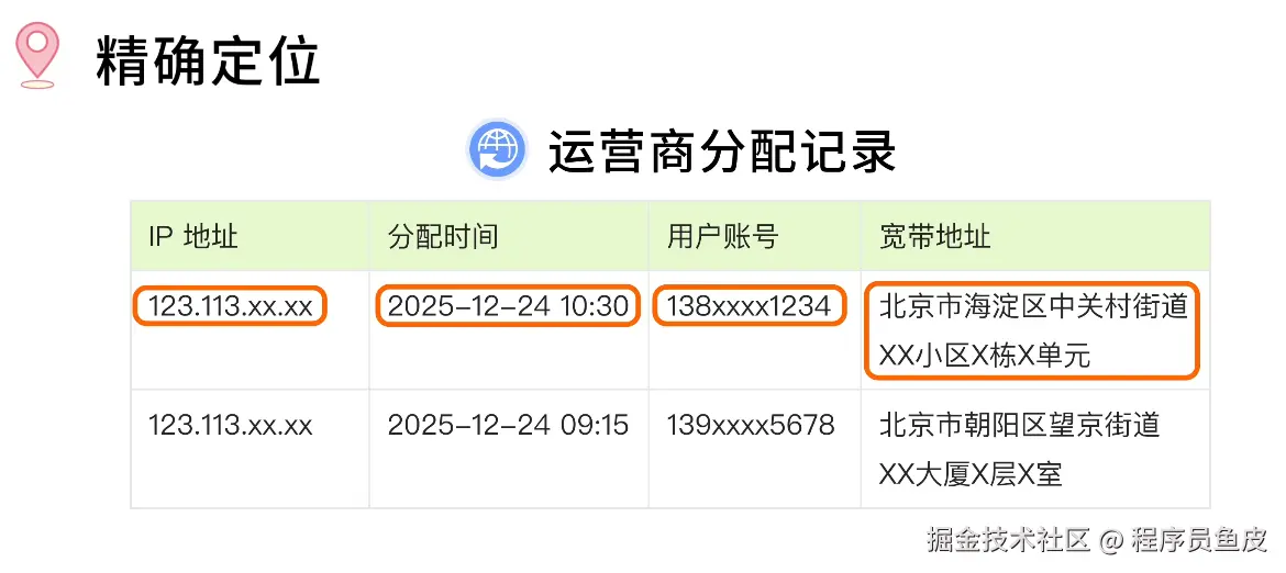 鱼皮:想要找到你的 精确定位,可以查询运营商那边详细的分配记录,记录着哪个 IP 在什么时间分配给了哪个用户,甚至有具体的安装地址。