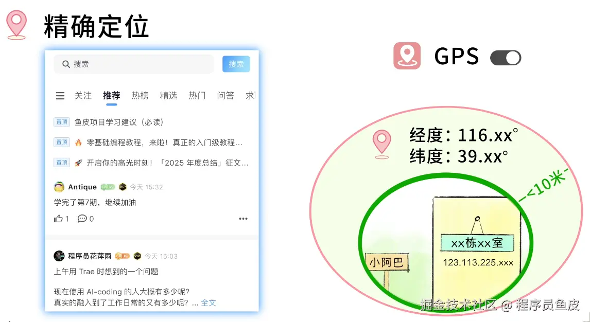 鱼皮:不过,还有其他精确定位的方法。比如你给 APP 开了 GPS 权限,APP 就能直接读取你手机里的 经纬度坐标,精度可以达到 10 米以内。