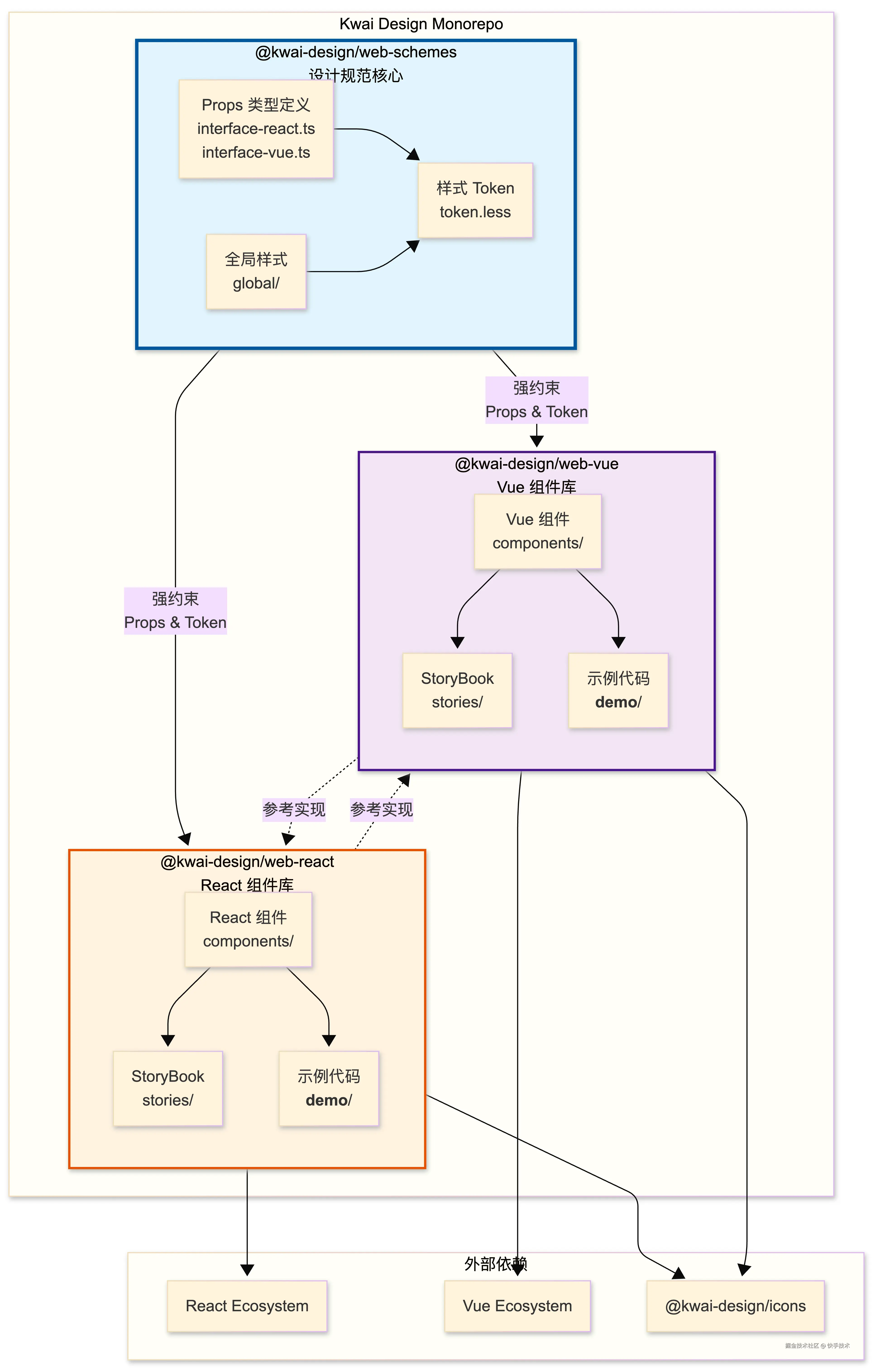 为了从根源上确保 Vue 与 React 技术栈在视觉与 API 基础上达成一致。为此,我们首先建立了统一设计变量(Design Tokens)层,将颜色、间距、字体等所有视觉变量统一定义,供 @kwai-design/web-vue 和 @kwai-design/web-react 共同引用,从而在源头上保障了视觉一致性。同时,我们创建了独立的 TypeScript 定义包 @kwai-design/web-schemes,作为双技术栈组件 API 的统一入口,并通过工具链实现强制对齐,彻底杜绝了 API 层面的分叉。历时三个月,我们最终攻克了双技术栈底层样式与类型系统隔离的难题,成功构建出 API 同源、视觉同构的 React 与 Vue 组件库基础框架。