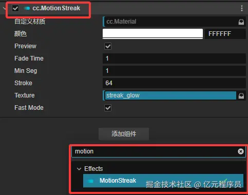 它的使用方法也非常简单,直接点击添加组件搜索,然后选择Effects下的MotionStreak即可完成添加。