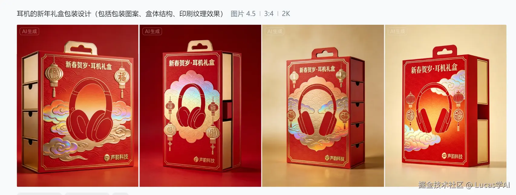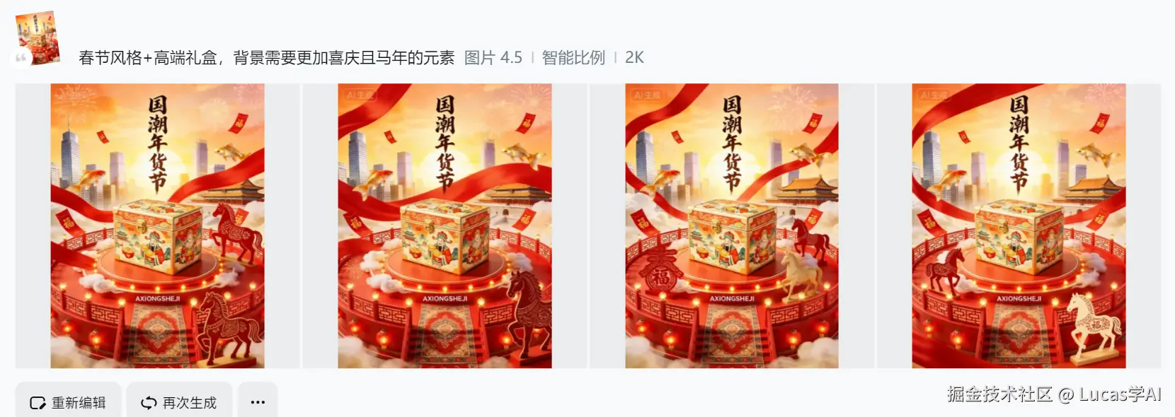 比如我只输入:“春节年货节,新年礼盒包装图案,红金配色,融合中国结、灯笼和福字元素,适合高端食品礼盒”,它就能输出: